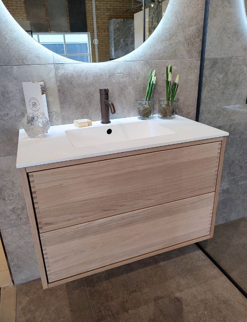 Hos Flisebutikken kan du se og mærke de snedker badeværelsesmøbler, vi fører, og få hjælp til at vælge størrelse, træsort og vaskeløsning. Vi hjælper dig med at finde det udtryk, der passer til dit hjem – uanset om du drømmer om natur eg, varm valnød eller mørk røget eg.